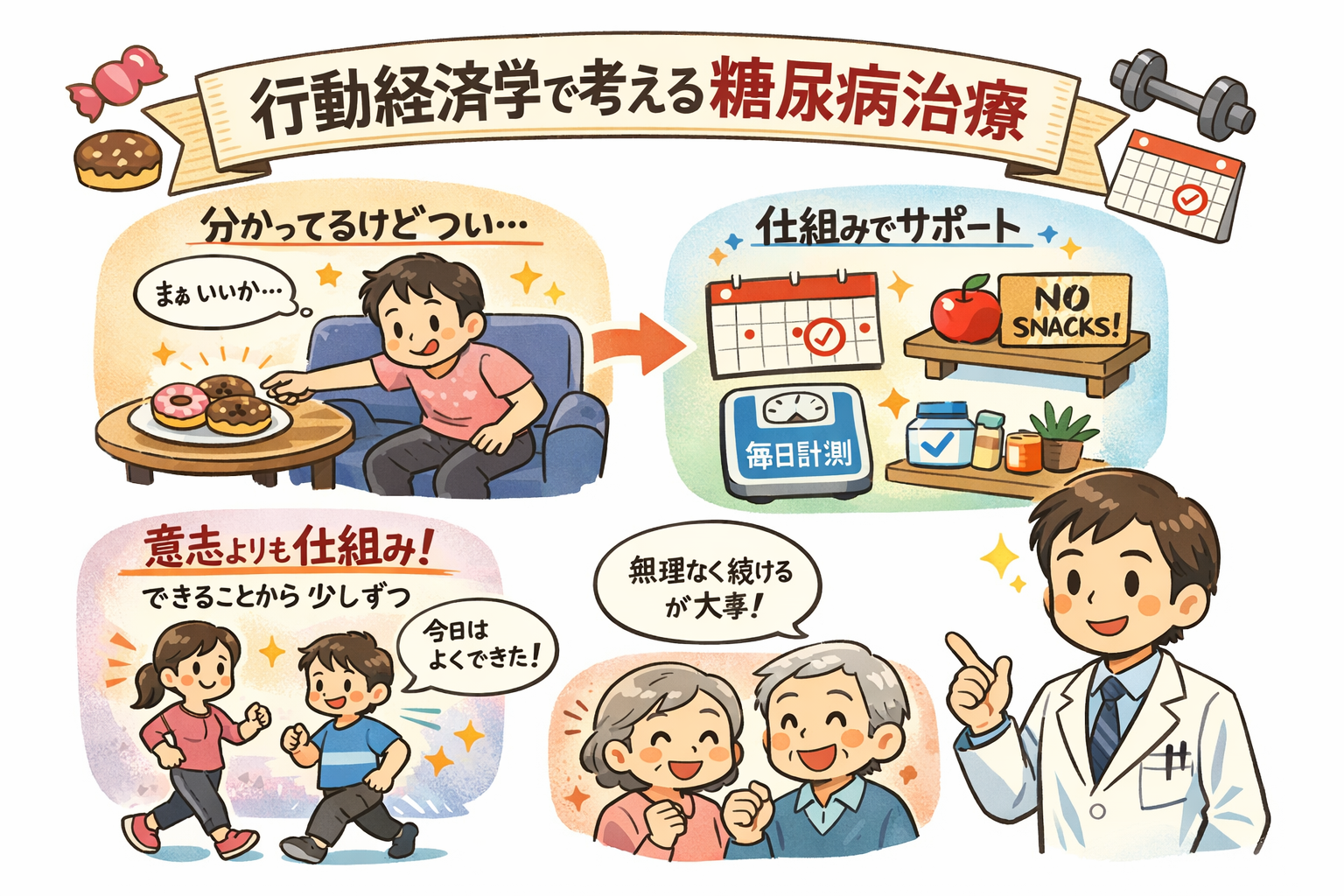 糖尿病は長く付き合っていく病気です。だからこそ、気合いや根性だけでは続きません。行動経済学の考え方を取り入れ、「無理なく続く生活」を一緒に作っていくことが大切です。当院でも、患者さん一人ひとりの生活に合わせた現実的な治療を大切にしています。できることから少しずつ、一緒に取り組んでいきましょう。