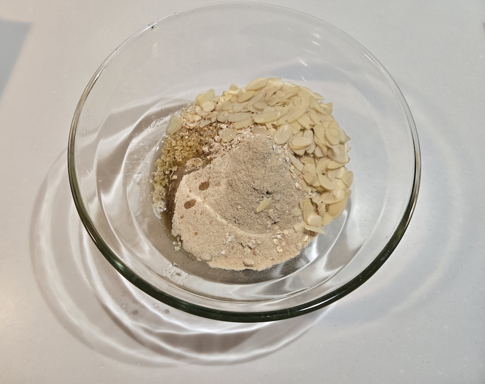オートミール(100g)、砂糖(大さじ2)、塩少々、ミルク(大さじ2)やお好きなオイル(大さじ2)、アーモンドスライス(20g)を入れて混ぜます。