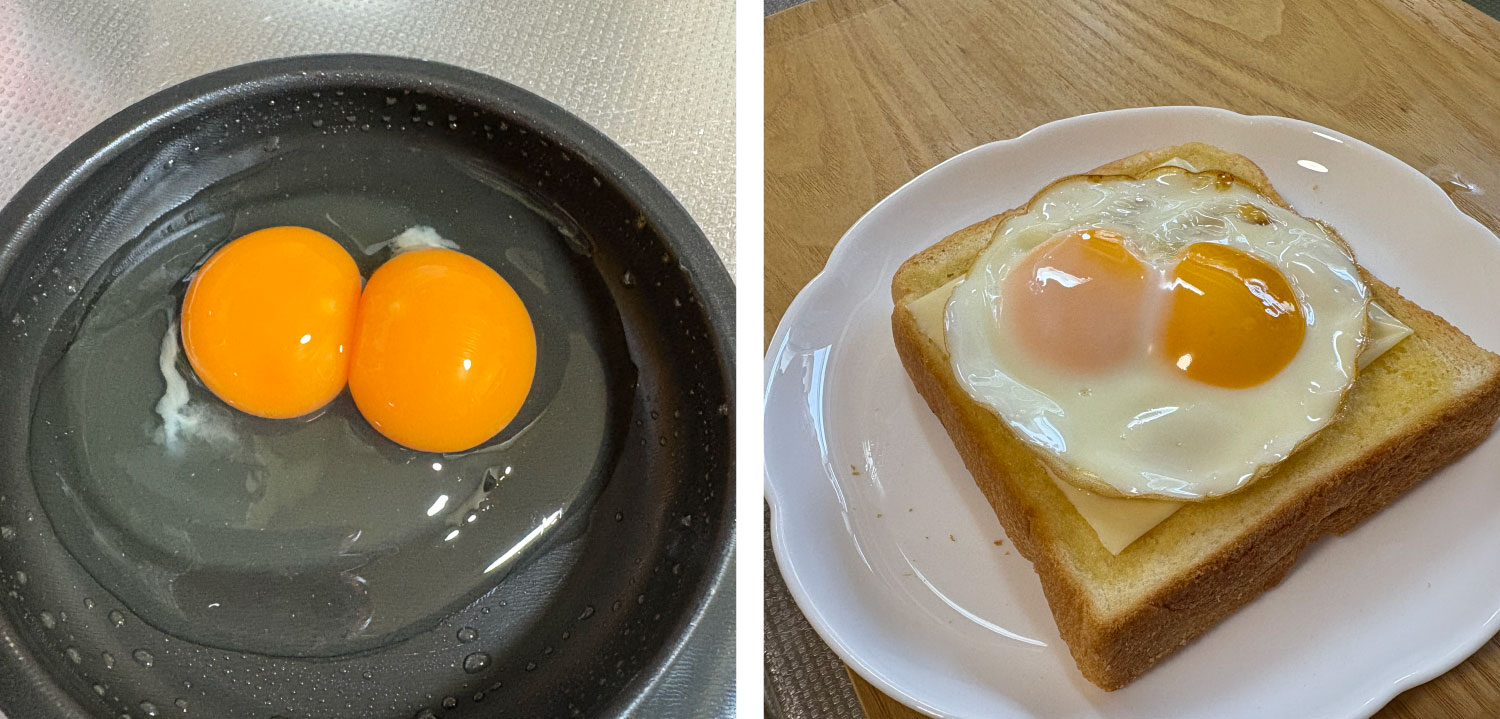 今朝、朝食の準備で卵を割ったら、なんと、黄身がふたつ入った「双子卵」でした