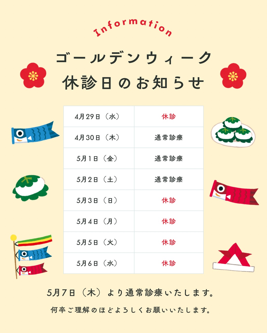 ゴールデンウィーク期間中の診療は、カレンダー通りとなっております。